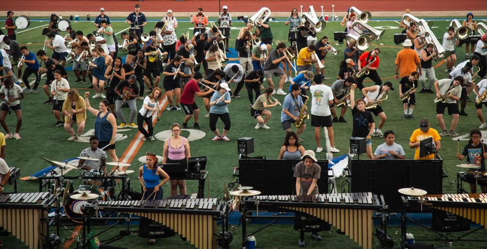 - UTA marching band brings 'The Hero’s Journey' to the fieldThe hero stood at the 50-yard line, flute slightly trembling in her hand. She stepped forward — alone. She took a few deep breaths to center herself and looked to the drum major, her bandmates and the color guard scattered across the field. Then she played the first note of her solo. “This is the reflection period,” said Kate Ullrich, music education junior and flute soloist. “We’re coming to a moment of clarity, and just coming to my senses as hero and being like, ‘This is what I need to do, I have the strength to do it.’” Ullrich and her fellow UTA bandmates have been hard at work preparing for their upcoming program, “The Hero’s Journey,” a blend of music, movement and formation which they perform during exhibitions at high school marching band competitions. Megan Moore, music education junior and drum major, said she has witnessed the show’s evolution from the beginning at band camp, when people didn’t really know each other, to now rehearsing three, sometimes four, times a week. “It’s just really cool to see everyone’s dedication and how much time people spend here with each other trying to get better,” Moore said. Estrella Ruiz, political science sophomore and mellophone player, said being in the band is physically and mentally demanding, but it’s achievable. “There’s so many people that are helping you and supporting you throughout the whole process that it makes it really enjoyable,” Ruiz said. That encouragement doesn’t come without effort. It's forged in the heat of the Texas sun during the hustle and repetition of weekly rehearsals. At a Thursday evening practice, the work was constant. Water breaks were brief. Band members hustled across the field, instruments and flags in hand. A voice over the speaker called out instructions as the band rehearsed the final part of its show. At one point, members assigned an odd-numbered drill chart sang through the music while those with an even-numbered drill chart counted their steps to the next formation. Sometimes it’s hard to stay focused during practice with everything happening around her, Ruiz said. But she reminds herself that slipping out of position could endanger her and those around her. Her passion also helps her stay present in practice, she said. “I enjoy what I do,” Ruiz said. “If I have a passion for something, why wouldn’t I pay attention to what I’m doing?” For others, the band is more personal — a place to feel seen and valued. Elizabeth Polk, studio art sophomore and auxiliary percussionist, a position otherwise known as rack, said that college band feels different from high school. Back then, she was one of many in a large percussion section. Now, she feels her presence truly matters, as the only UTA band member who plays rack. “There was this one time I ran into a professor and he’s like, ‘Well, I mean if you keep coming back, we’ll just write rack parts for you,’ and I’m like, ‘Okay, that sounds cool, I’m down,’” she said. Beyond rehearsals and relationships, it all comes back to the story the band is telling. The band brings the hero’s journey to life — not just through drill formation and visuals, but through music that carries the audience through each phase. Chris Evans, associate director of bands, said the show features selections from “Super Mario Bros. Opus,” from “The Super Mario Bros. Movie,” “Raisuli Attacks” by Jerry Goldsmith and “Fly to Paradise” by Eric Whitacre. The marching show starts upbeat, Evans said, before turning dark like an “inevitable clash with the bad guy.” From there, the music shifts toward inner resolve and ends in a final battle. Through movement and equipment changes, the color guard adds visual layers to the show. Rebekah Watson, operation and supply chain management sophomore and colorguard member, said the opener is lighthearted and ends with a Mario jump. For the ballad, the team uses swing flags, which are “nice and pretty,” she said. The show ends with the conflict, Watson said, and the choreography reflects that: the color guard sweeps across the field in sharp, urgent patterns, tossing their flags in 45-degree angles that cut through the air at jagged angles, like a visual clash unfolding. After hours on the field Thursday evening, with the sunlight slowly fading away, the energy held. Members checked angles and made corrections between each rep as the metronome clicked steadily. As the final note of her solo rang out, Ullrich stood steady, a brass quintet behind her – no longer playing the hero but becoming her. “I have been empowered as a hero,” Ullrich said. “I’ve been a changed person – and now I’m going to get out there.” @tay._.sansom news-editor.shorthorn@uta.edu
